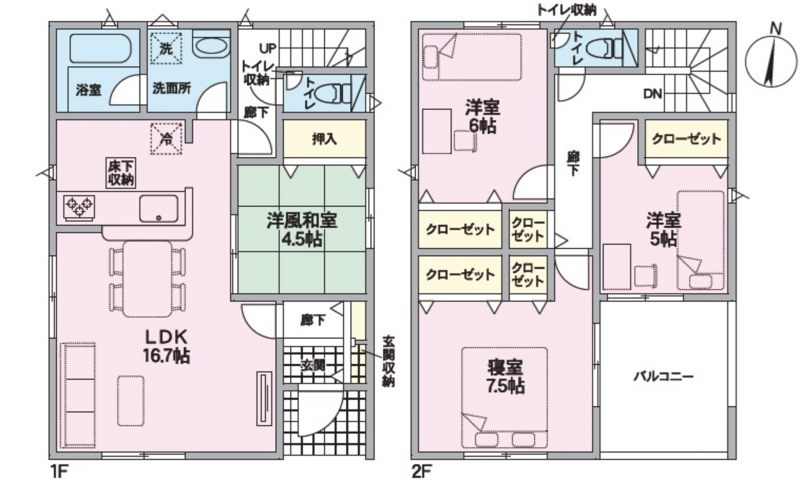 - システムキッチン、カウンターキッチン、食器洗浄乾燥機、シャンプードレッサー、洗浄便座、浴室乾燥機、複層ガラス、ルーフバルコニー、モニタ付インターホン、駐車場2台分、床下収納、トイレ2箇所
