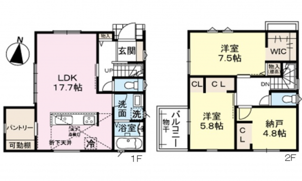 - システムキッチン、カウンターキッチン、洗浄便座、浴室乾燥機、複層ガラス、ウォークインクローゼット、モニタ付インターホン、床下収納、トイレ2箇所