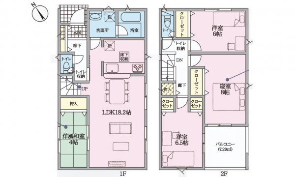 - システムキッチン、カウンターキッチン、シャンプードレッサー、洗浄便座、浴室乾燥機、複層ガラス、ルーフバルコニー、モニタ付インターホン、駐車場2台分、床下収納、トイレ2箇所