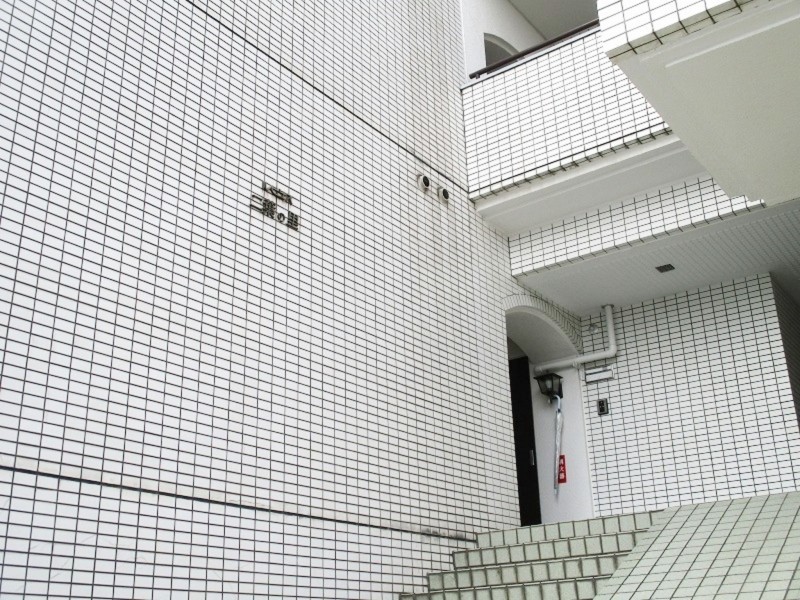 ▼白を基調としたタイル張の外観